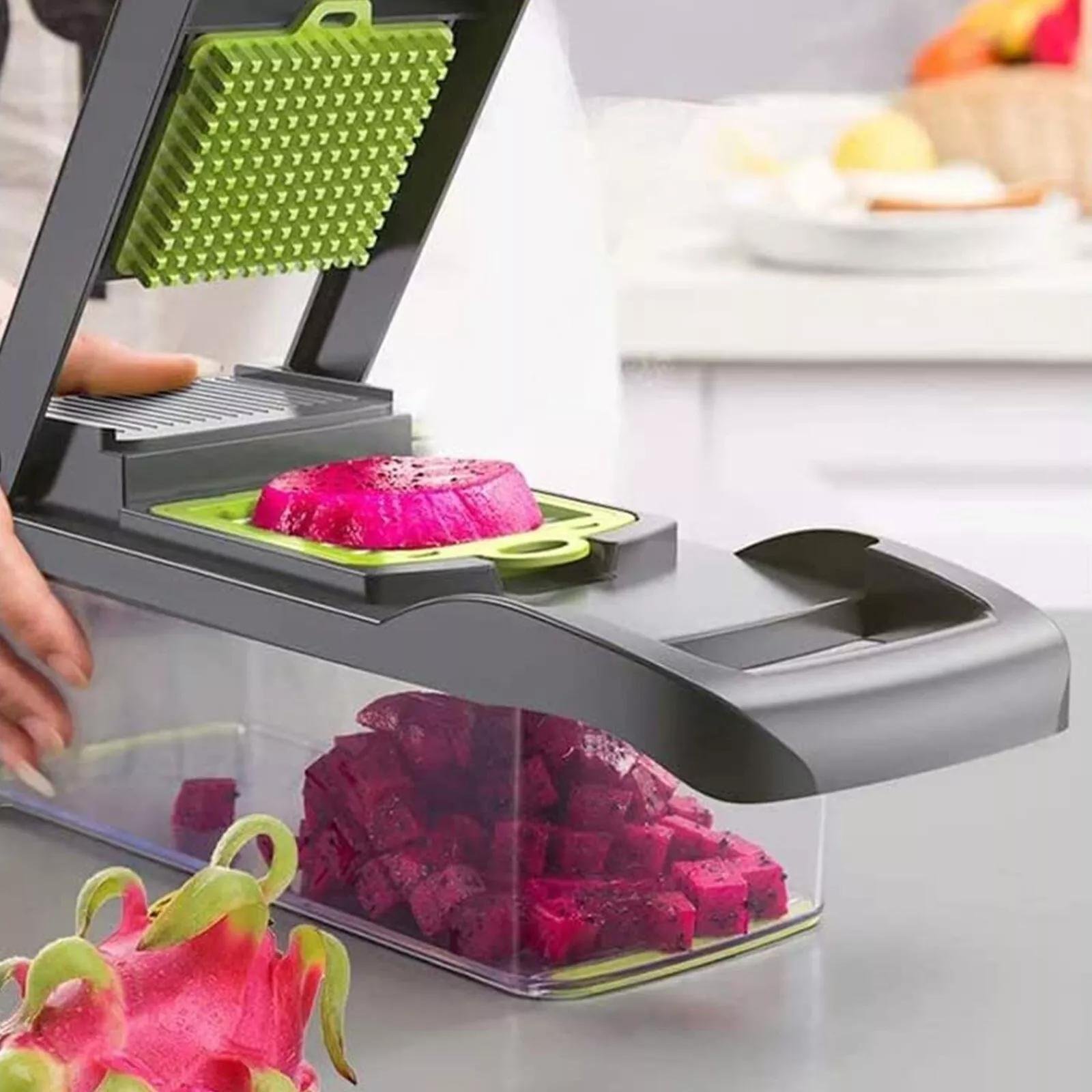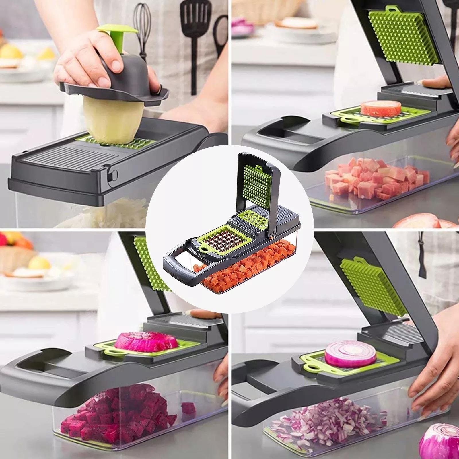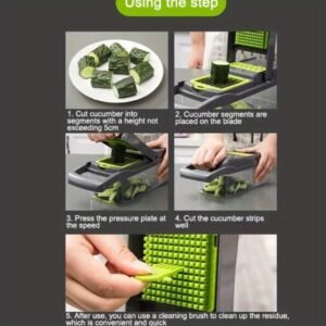 This 15-in-1 Kitchen Prep Tool is a versatile all-in-one solution for preparing salads, fruits, and vegetables. Featuring a durable design with a peeler, cutter, slicer, dicer, and chopper, it simplifies food prep with multiple interchangeable blades for various cuts. The transparent container collects chopped ingredients, while additional accessories like a grater and egg separator enhance functionality. Ideal for quick, efficient meal preparation, it comes with a range of colorful produce to inspire healthy cooking.