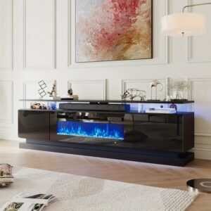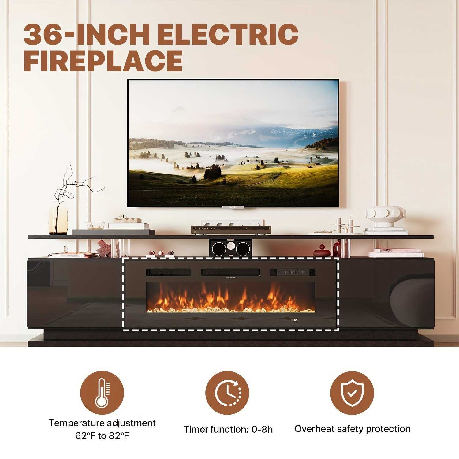 36″ Modern Black Fireplace TV Stand for 80″ TVs: ETL/CSA Heater, 12 Flame Colors, 5 Brightness Levels, Glossy Wood Grain Console with Storage