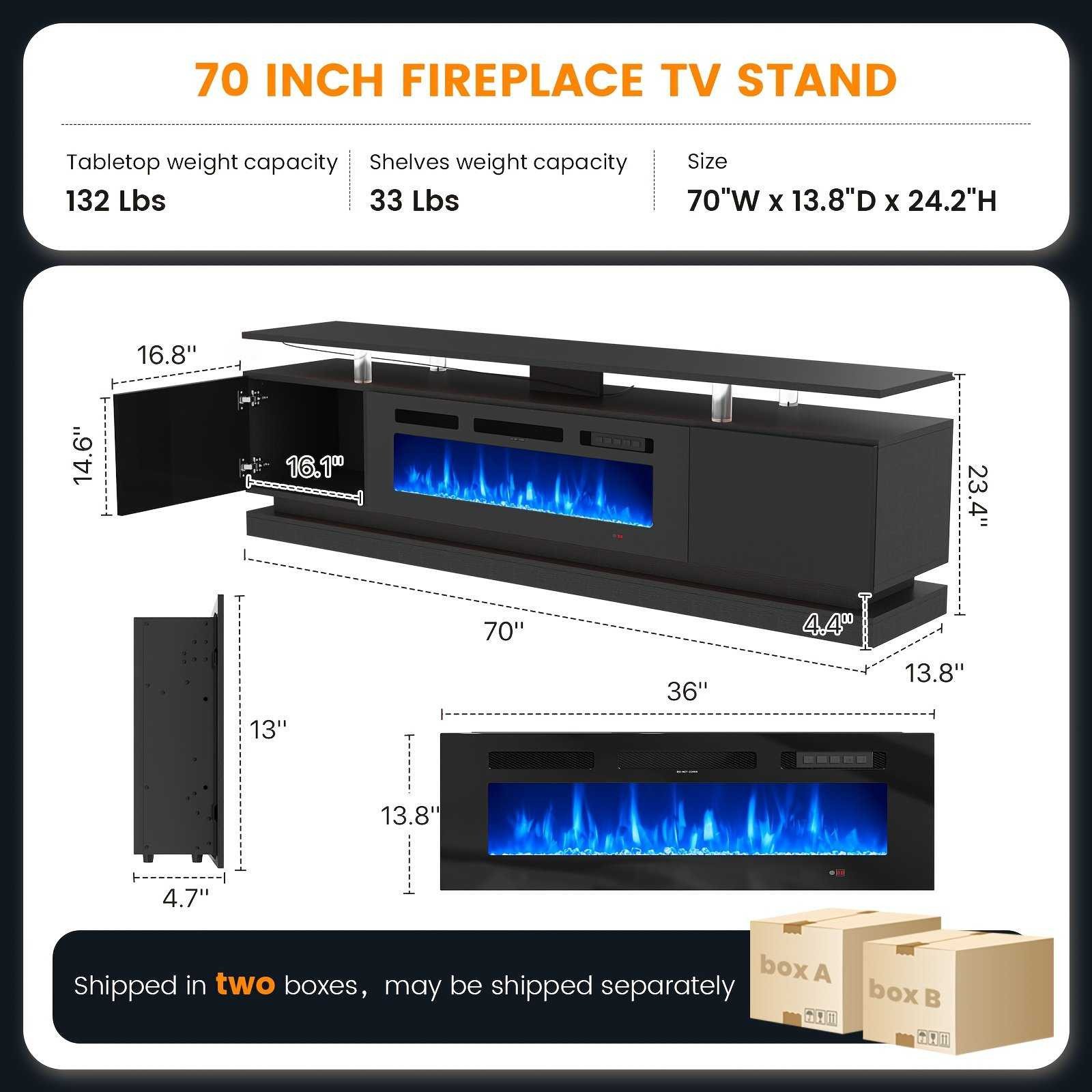 [TV Stand with 36″ Electric Fireplace] This 70″ TV stand features a built-in 36″ fireplace with 12 flame colors, 5 brightness levels, and 36 LED combos—customize the heat and ambiance to match your mood.
