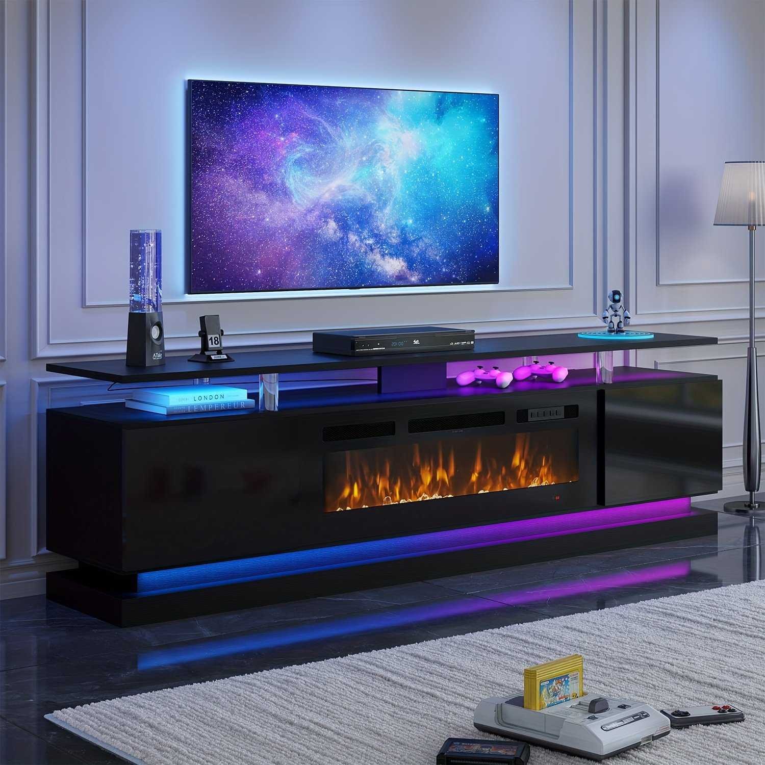 1 review for 36″ Modern Black Fireplace TV Stand for 80″ TVs: ETL/CSA Heater, 12 Flame Colors, 5 Brightness Levels, Glossy Wood Grain Console with Storage