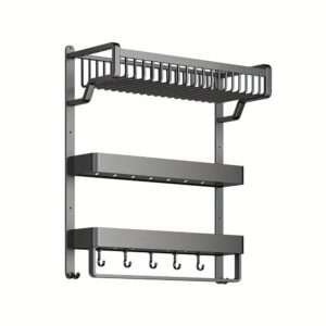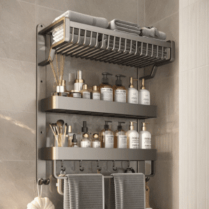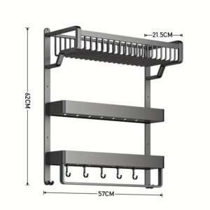 Introducing our innovative No-Drill Aluminum Bathroom Shelf! This wall-mounted organizer features a towel bar and 5 hooks, providing ample storage for toiletries, cosmetics, and towels.