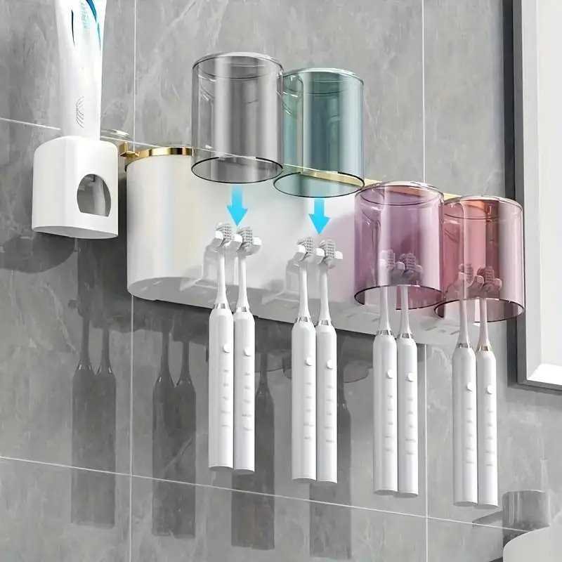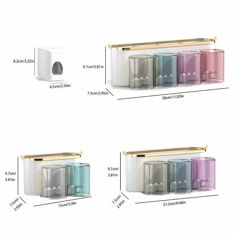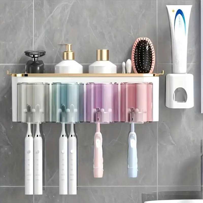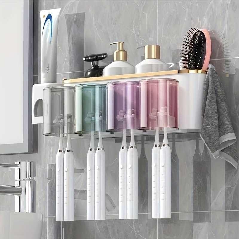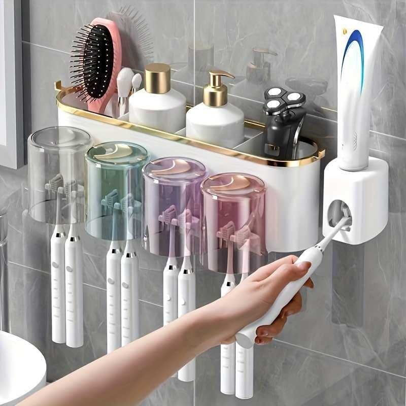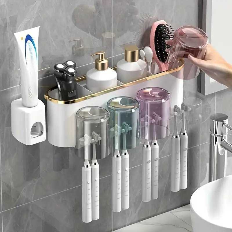 Features: Toothpaste dispenser, toothbrush holders, magnetic cups, and storage shelf.